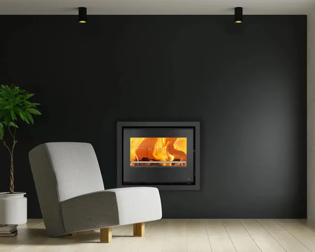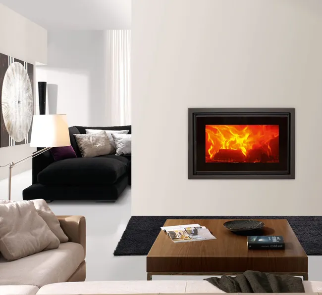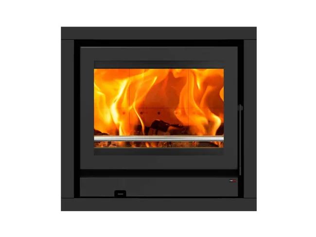 Materiales utilizados para la construcción de la caldera: Chapa de acero negra lisa de 4 mm, haz de tubos de acero Manesmann. Revestimiento exterior, campana y cajón fabricados en chapa lisa de color negro de 2 mm.Pintado a alta temperatura. Puerta corredera vertical “arriba y abajo” mediante coronas y cadenas. Vidrio cerámico resistente a 800°. Apertura de puerta frontal para limpieza del cristal. Regulación automática de humos, en la posición cerrada de la puerta corredera, la válvula de humos situada en la parte superior de la campana se cierra parcialmente, actuando como moderador del humo y aumentando la eficiencia calórica. Aire de combustión mediante boquilla Ø 100 situada en la parte inferior de la chimenea para conexión al exterior. El aire primario, canalizado hacia el interior de la estructura de la termochimenea, fluye directamente hacia la combustión. El aire secundario, situado encima de la puerta a ambos lados, favorece la postcombustión del carbón no quemado, aumentando la eficiencia y manteniendo el cristal limpio. • Estructura interna aislada, con lana de roca de alta densidad, para reducir la dispersión del calor. Alojamiento de sonda para unidad de control de temperatura del agua. Presión máxima de funcionamiento atm 2 Presión de prueba atm 3,5