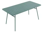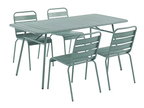 Comedor de jardín de metal verde almendra MIRMANDE: una mesa de 160 cm de largo y 4 sillas apilables