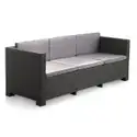 Conjunto Manhattan para la decoración exterior de jardines y terrazas. Muebles de resina sin componentes metálicos para evitar la oxidación, fabricados en España con materiales reciclados. Conjunto compuesto por un sofá de tres plazas, una plaza individual, un puf y una mesa baja. Además, se incluyen recursos de apoyo y asistencia. Color: grafito. Medidas sillón (AxProfxL): 72x66x74 cm. Medidas sofá (HxProfxL): 72x66x190 cm. Dimensiones mesa (HxProfxL): 34x57x57 cm. Medidas del puf (HxProfxL): 39x56x56 cm.