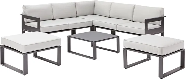 ¡En familia o con amigos, reúnase para disfrutar de momentos agradables en el salón esquinero Odyssea! En exterior o bajo la pérgola Odyssea, su diseño combinado con su color antracita aporta un toque moderno y acogedor a tus espacios exteriores. Un completo salón esquinero. Disfrute de un momento de relajación cómodamente sentado en el salón esquinero Odyssea. Compuesto por un sofá, una mesa de centro y dos pufs individuales, es perfecto para relajarse en una tarde soleada. Ideal para 5 personas, el sofá esquinero presenta un revestimiento textil acolchado que garantiza un alto nivel de confort, reforzado por la presencia de cojines en el respaldo y el asiento. Diseñados en poliéster, están tratados con un tratamiento anti-UV y repelente al agua que retrasa la decoloración y permite la limpieza inmediata de manchas accidentales. Los muebles de jardín bajos Odyssea también están equipados con dos reposapiés, lo que te permitirá sentar a dos personas más donde quieras. Tienen las mismas características que el sofá y son ligeros: puedes moverlos con una sola mano. Una mesa de centro completa el mobiliario de jardín Odyssea. Ideal para un aperitivo con amigos, permite disponer en todo momento de una superficie de apoyo muy práctica. Para una mayor resistencia a las variaciones climáticas, todos los elementos están fabricados en aluminio. Este material robusto es resistente a la humedad y al óxido y es muy fácil de limpiar. Con un diseño vanguardista, las líneas de los muebles de jardín bajos Odyssea son puras. Las patas y reposabrazos tienen forma de “U”, lo que refuerza el estilo geométrico y moderno del conjunto. Combina tu conjunto con Pergola Odyssea para obtener un resultado armonioso. Consejos de mantenimiento Para preservar sus muebles, le recomendamos acondicionarlos para el invierno bajo una funda de material transpirable durante largos períodos de inactividad. Asimismo, los cojines son completamente desenfundables y deben protegerse de la humedad cuando no se utilizan. El aluminio se puede limpiar fácilmente con un paño húmedo y un producto neutro. Está fabricado con materiales ligeros y resistentes al mismo tiempo. Su estructura de aluminio resiste la oxidación. Debajo de los cojines, la zona de estar está confeccionada en tela para realzar su suavidad. El asiento y el respaldo están fabricados en tela acolchada. Esta tela de PVC ofrece una excelente comodidad para sentarse, es resistente a la intemperie y se puede limpiar fácilmente
