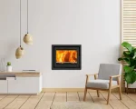 Hogar de leña Caramulo Eco 70 fabricado en acero con acabado en negro y con interior de vermiculita. Es de colocación frontal, tiene una potencia de 9,4 kW y puede calentar hasta una superficie de 85 m². Clase energética: A. Medidas: 69 x 57 x 47 cm (ancho x alto x fondo).