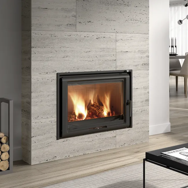 Insert de leña Vidago Eco 70 fabricado en acero con acabado en negro y con interior de vermiculita. Es de colocación frontal, tiene una potencia de 9,3 kW y puede calentar hasta una superficie de 84 m². Clase energética: A. Medidas: 69 x 55 x 47 cm (ancho x alto x fondo).