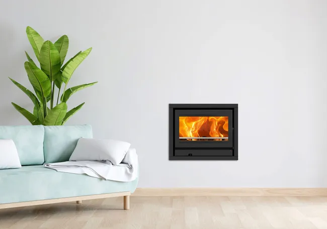 Insert de leña Vimeiro Eco 70 fabricado en acero con acabado en negro y con interior de vermiculita. Es de colocación frontal, tiene una potencia de 9,3 kW y puede calentar hasta una superficie de 84 m². Clase energética: A. Medidas: 69 x 55 x 47 cm (ancho x alto x fondo).