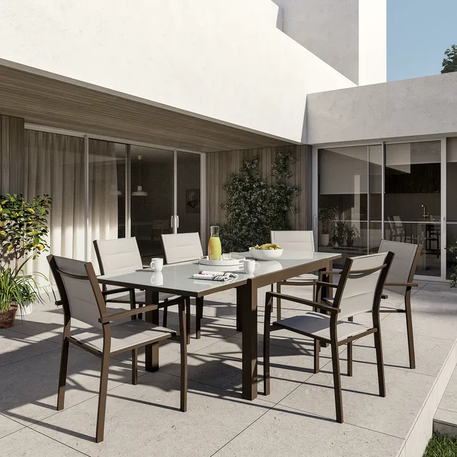 Mesa de jardín Naterial Lyra II Up/Down marrón para recibir hasta 8 invitados. Su bandeja se desliza para revelar una extensión de 90 cm y pasar de una mesa compacta de 130 x 90 cm a una generosa longitud de 2,20 m. Su bandeja de cristal liso es fácil de limpiar y no sufre los cambios del tiempo. Su estructura de aluminio es muy resistente al óxido y a la intemperie. Para ganar estabilidad, las mesas están equipadas con una pata regulable que compensa las irregularidades de tu terraza. Sus líneas de diseño y colores combinan a la perfección con las sillas y sillones de la gama Naterial Orion II. Para prolongar la vida de tu mesa, recuerda protegerla de los ataques del invierno cubriéndola con una funda. Medidas: 90 x 75 x 130/220 cm (ancho x alto x largo).