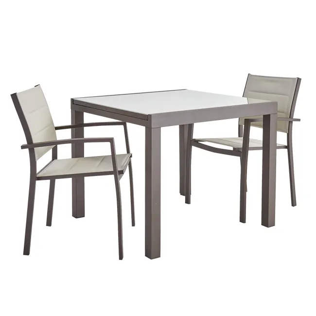 Mesa de jardín Naterial Lyra II Up/Down marrón para recibir hasta 6 invitados. Sus dimensiones son especialmente adecuadas para espacios reducidos. Su bandeja se desliza para revelar una extensión de 70 cm y pasar de una mesa compacta de 90 x 90 cm a una generosa longitud de 1,60 m, ofreciendo así 2 asientos adicionales. Su bandeja de cristal liso es fácil de limpiar y no sufre los cambios del tiempo. Su estructura de aluminio es muy resistente al óxido y a la intemperie. Para conseguir estabilidad, las mesas están equipadas con una pata ajustable que compensa las irregularidades de tu terraza. Sus líneas de diseño y colores combinan a la perfección con las sillas y sillones de la gama Naterial Orion II. Para alargar la vida de tu mesa, recuerda protegerla de los ataques del invierno cubriéndola con una funda. Medidas: 90 x 75 x 90/160 cm (ancho x alto x largo).