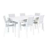 Mesa extensible Naterial Odyssea en aluminio blanco, apta para 10 personas. Unos segundos y una mano bastan para extenderlo 60 cm y pasar de 1,80 m a 2,40 m de longitud. Su estructura y bandeja de aluminio son resistentes a la oxidación y a la intemperie. Para ganar estabilidad, las mesas están equipadas con una pata regulable que compensa las irregularidades de tu terraza. Sus líneas sencillas le confieren un estilo de diseño que combina a la perfección con el resto de muebles de la gama Odyssea, así como con las sillas. la gama Orione. Para alargar la vida de tu mesa, recuerda protegerla de los ataques del invierno cubriéndola con una funda. Medidas: 100 x 76,5 x 180/240 cm (ancho x alto x largo).