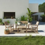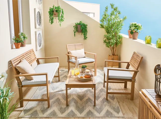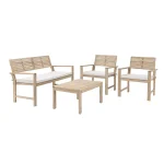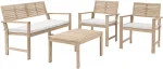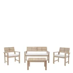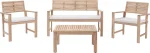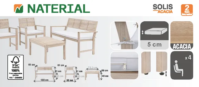 Conjunto de mueble de porche Solis para jardín o terraza compuesto por mesa, sofá de 2 plazas y 2 sillones fabricados en madera de acacia con acabado natural. La mesa rectangular y las sillas requieren mantenimiento con aceite especial para madera y limpieza con un paño húmedo. Las sillas y el sofá disponen de 3 cojines de asiento de poliéster color beige con funda desenfundable para facilitar su limpieza. Para su mantenimiento se recomienda protegerlos de la luz solar directa y almacenarlos en un lugar seco y ventilado y cubrirlos con una funda para muebles. Medidas de la mesa: 73,5 x 40 x 50 cm. Sofá: 122 x 61 x 81 cm. Sillones: 62 x 61 x 81 cm (ancho x alto x fondo).