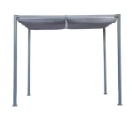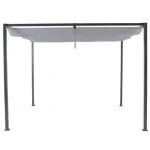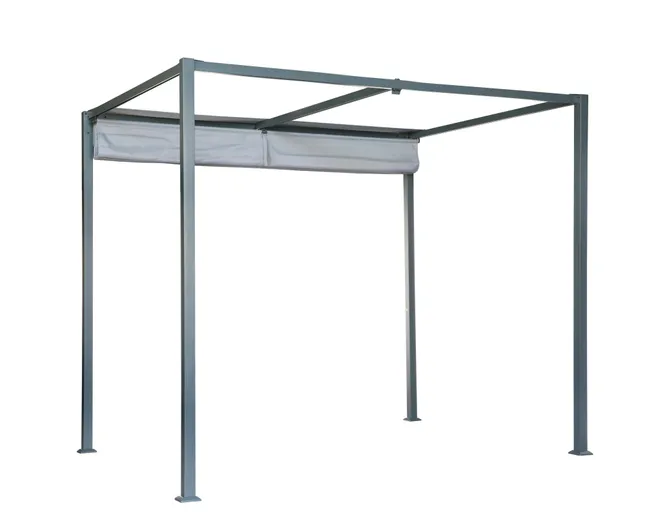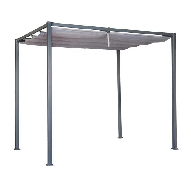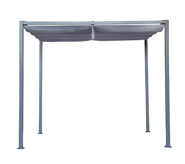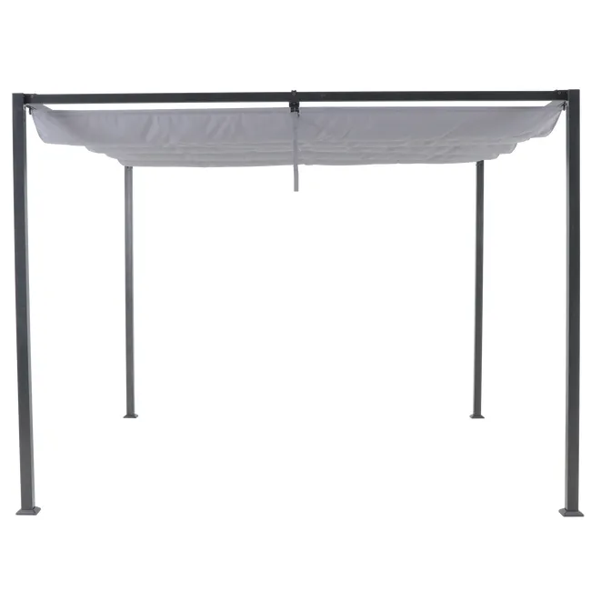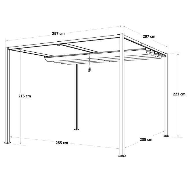 Pérgola para terraza o jardín serie Horali, de Naterial, con estructura de aluminio y acero gris antracita y cobertor corredero de poliéster gris. Su estructura tiene un tratamiento resistente a la intemperie. La funda tiene un peso de 180 g/m² y cubre una superficie de 8,82 m². Puedes fijar la pérgola al suelo con los tornillos adecuados. Medidas: 2,97 x 2,23 x 2,97 cm (ancho x alto x largo).