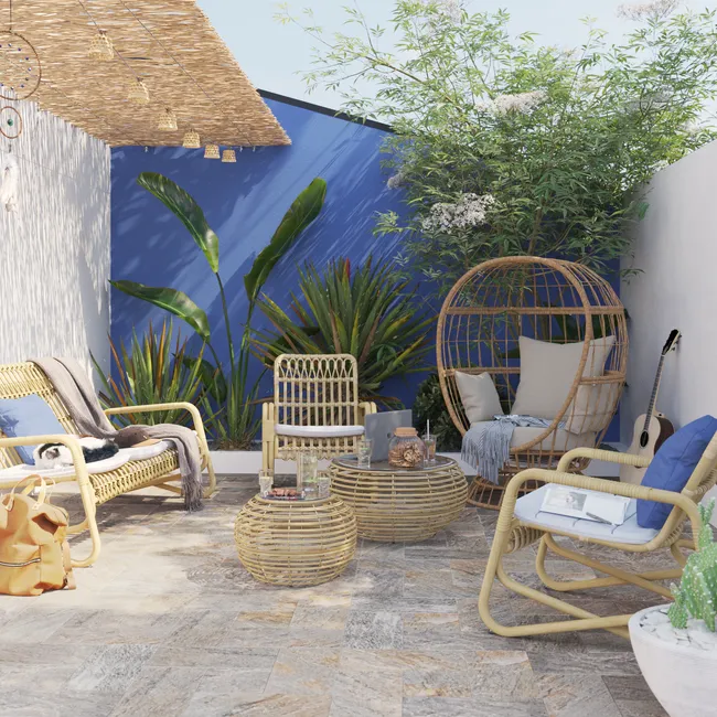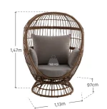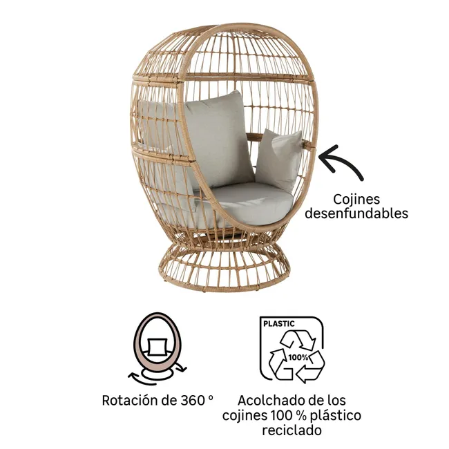 Sillón relax de exterior Juno con estructura de acero revestida en ratán sintético. Los cojines están fabricados en poliéster y cuentan con fundas desenfundables para un lavado más cómodo. Ideal para relajarte y amueblar tus espacios exteriores con su estilo neoclásico. Soporta un peso máximo de 160 kg. Para su mantenimiento, recomendamos guardarlo en interiores, alejado de la luz solar directa, y guardarlo en un lugar seco y ventilado cuando no esté en uso (o cubrirlo con una funda para muebles). Medidas: 66 x 71 cm (ancho x fondo).