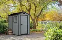 Refugio Manor de resina 4×6, con acabado en gris, ideal para guardar herramientas y utensilios de jardín. Tiene una superficie de 2,2 m2. Es resistente a la intemperie y tiene una construcción de doble panel y un piso que garantiza que sus pertenencias se mantengan limpias y secas. Tiene una rejilla de ventilación incorporada y se puede cerrar con llave para mayor seguridad. Fácil de montar. Medidas: 130 x 198 x 192 cm (ancho x alto x fondo).